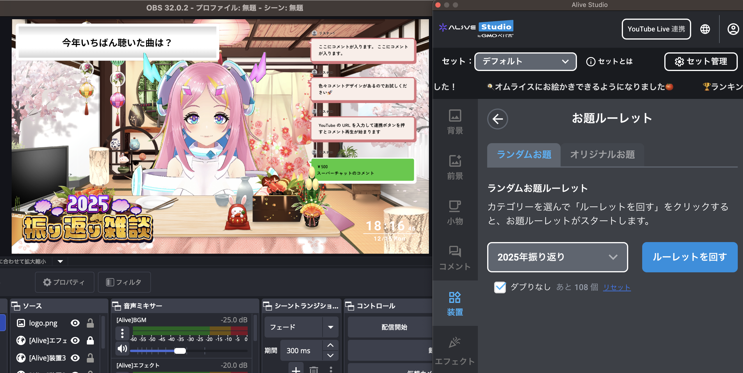 - Alive Studioの素材にある「2025年ふりかえり雑談」ロゴを配信画面に出す