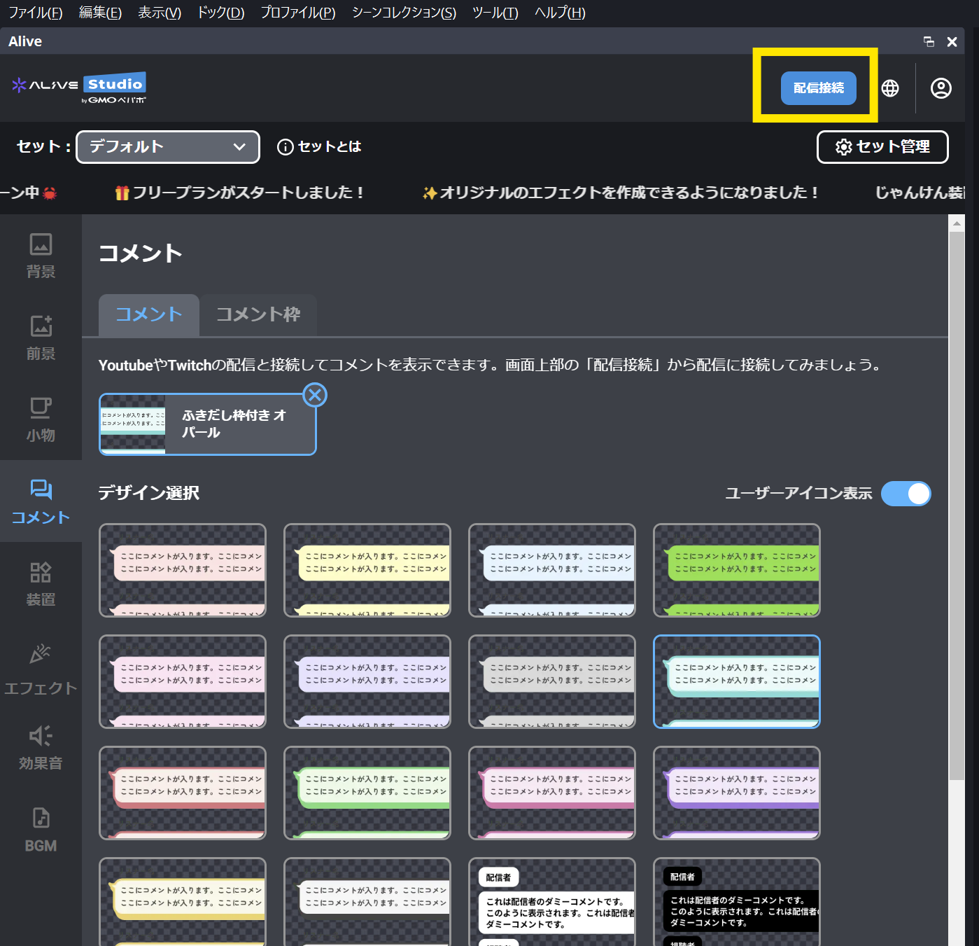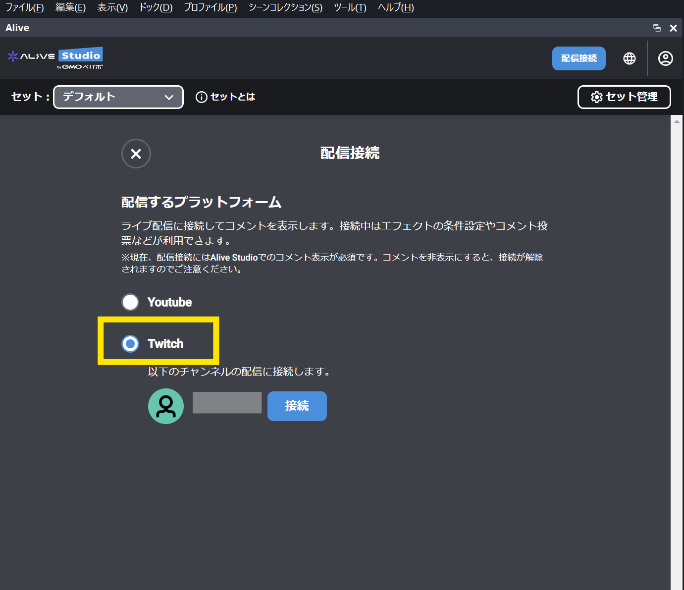 ※配信画面に表示できるコメントは、TwitchまたはYouTubeライブのいずれか一方のみとなります。