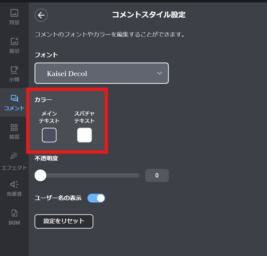 テキストの文字色や、スパチャコメントの吹き出し色等を変更できます。