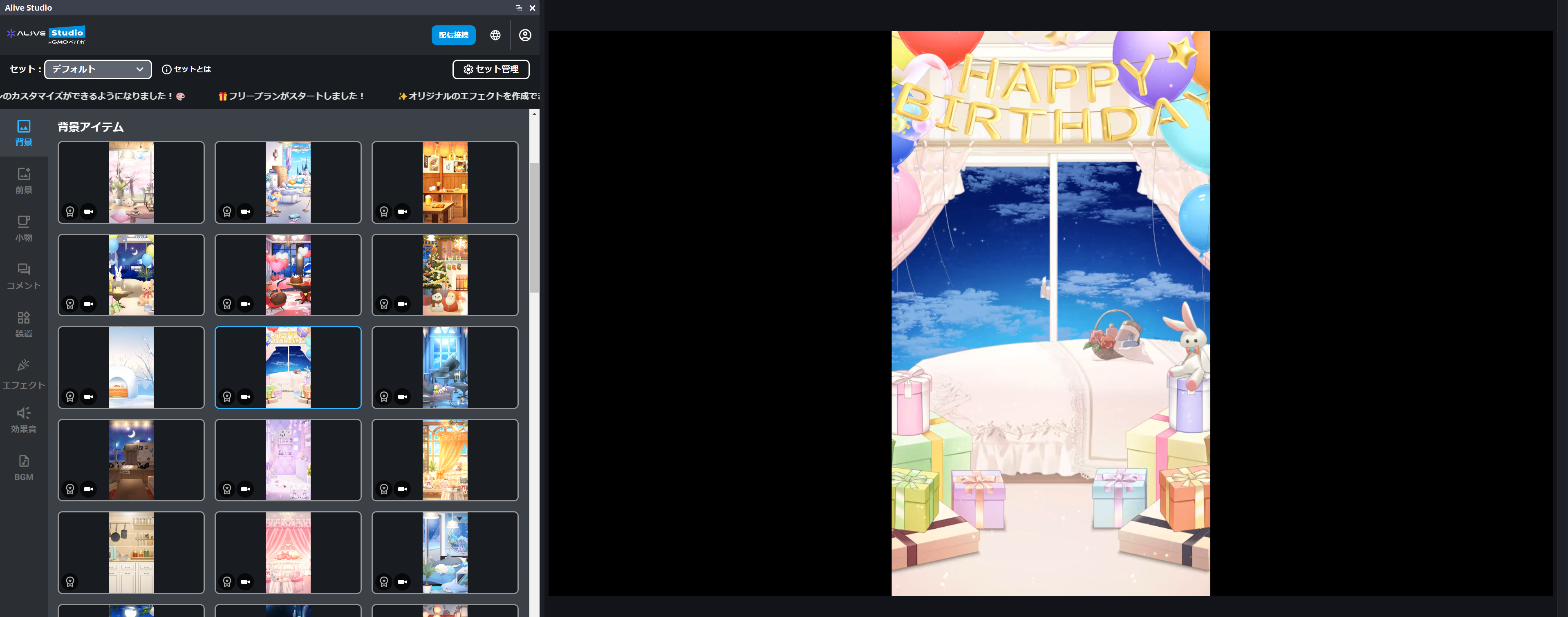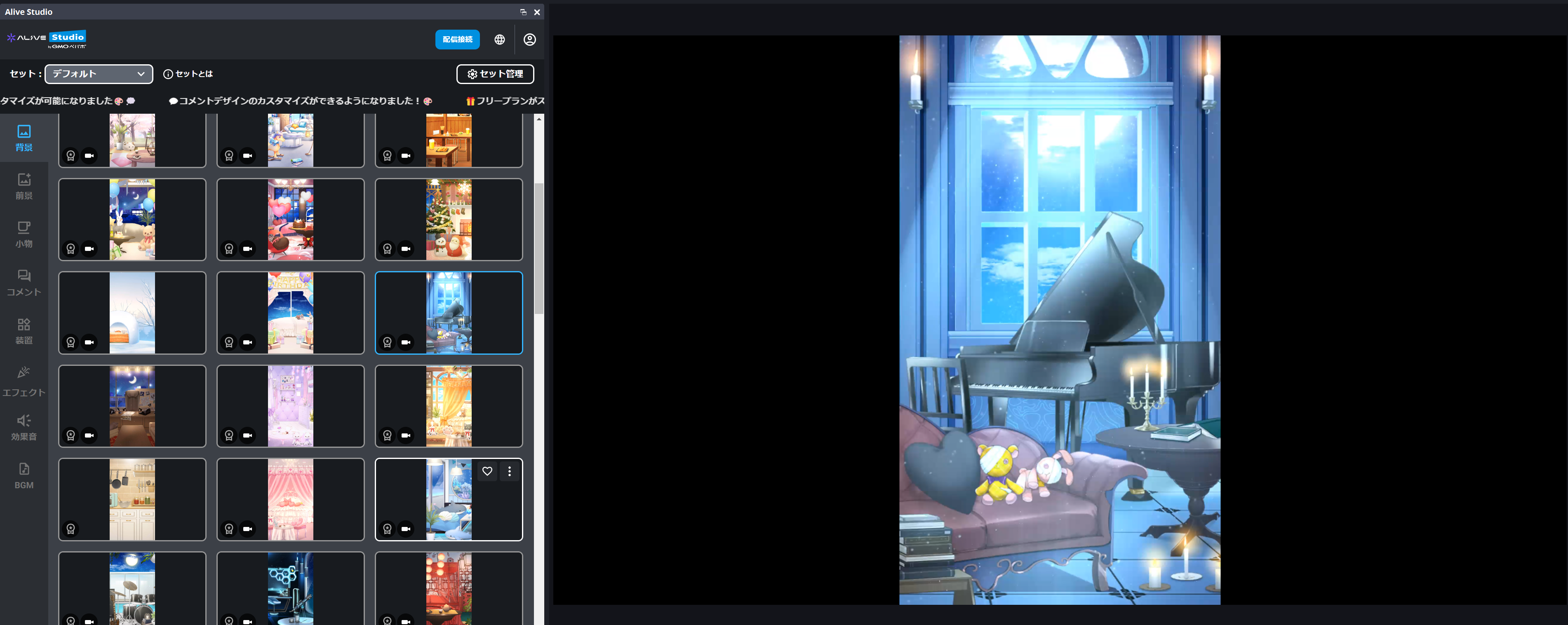 お部屋背景や机、小物などの素材が1,500点以上、さらに時計やテロップ、お題ルーレットなどの便利ツールも盛りだくさん。