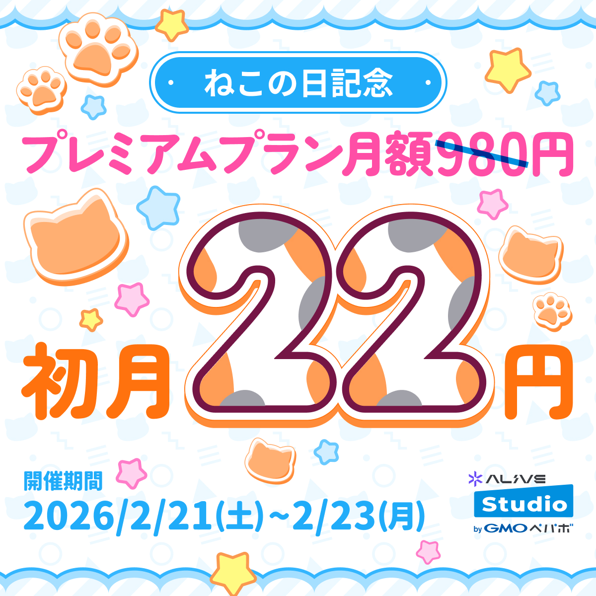 いつもAlive Studioをご利用いただきありがとうございます。2月22日の「猫の日」にあわせて、期間限定の特別キャンペーンを開催します🐱