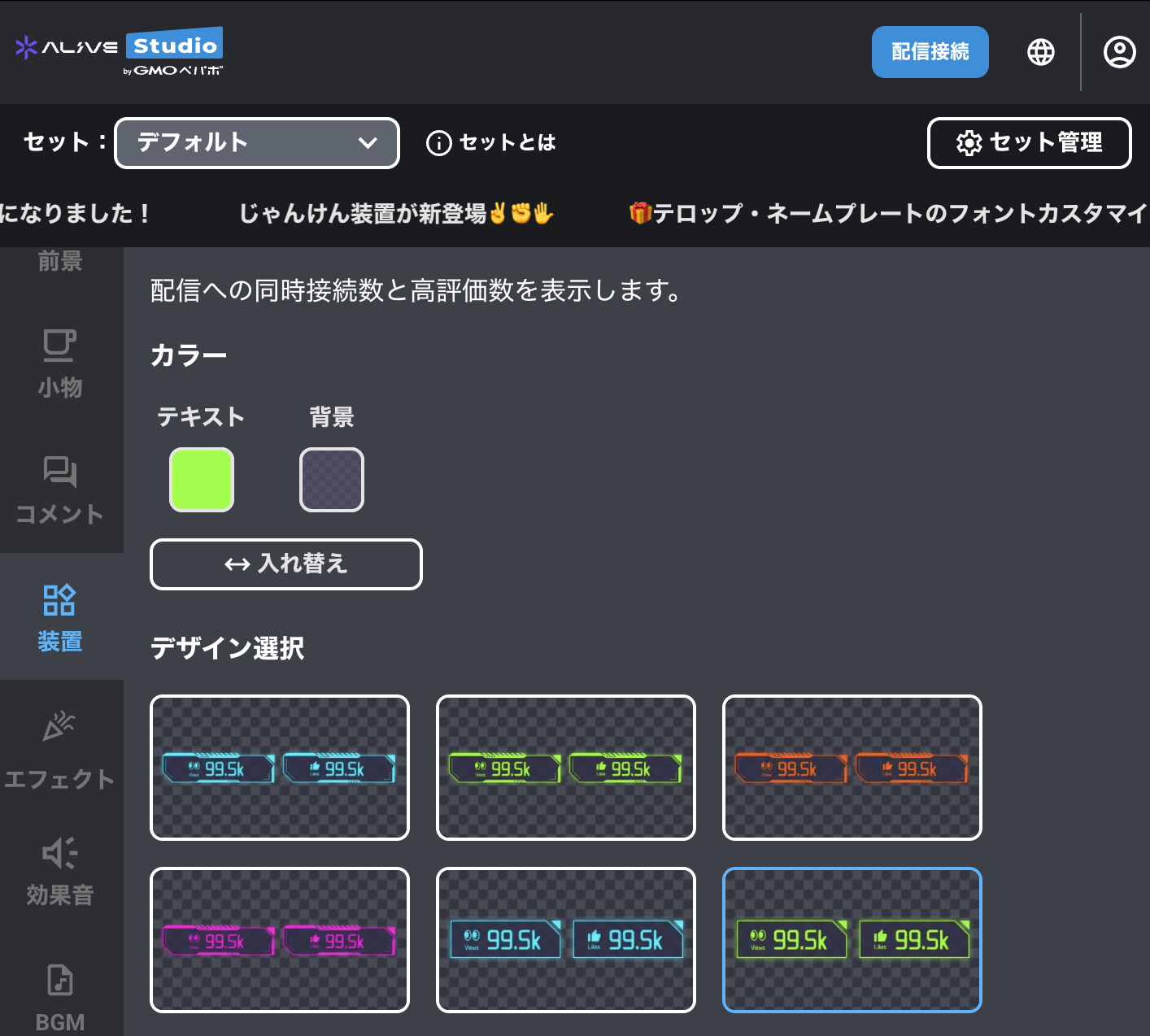 デザインの色は自由に変更ができます。配信画面の雰囲気にあわせてカスタマイズしてみてね!