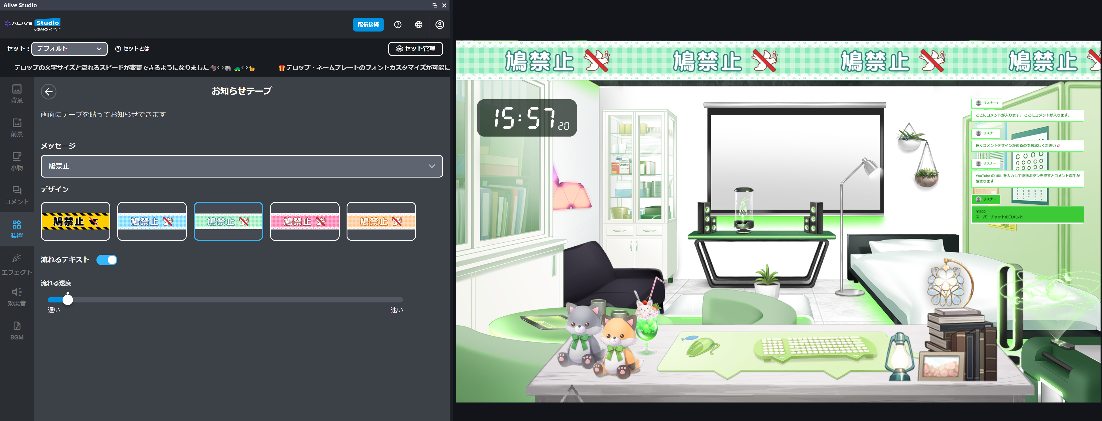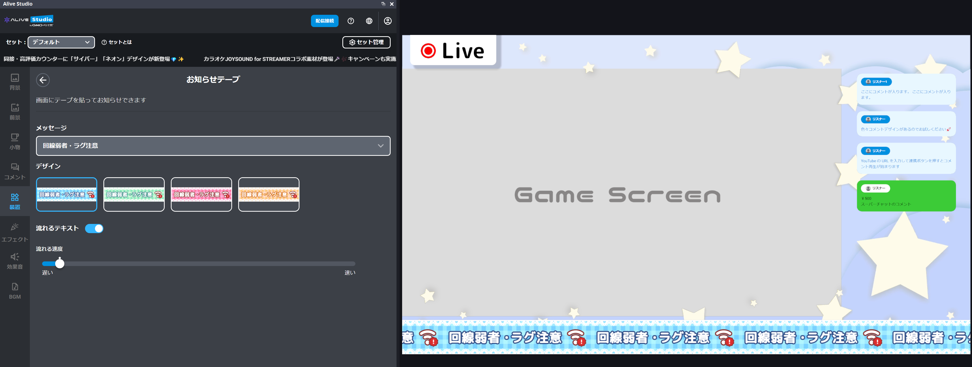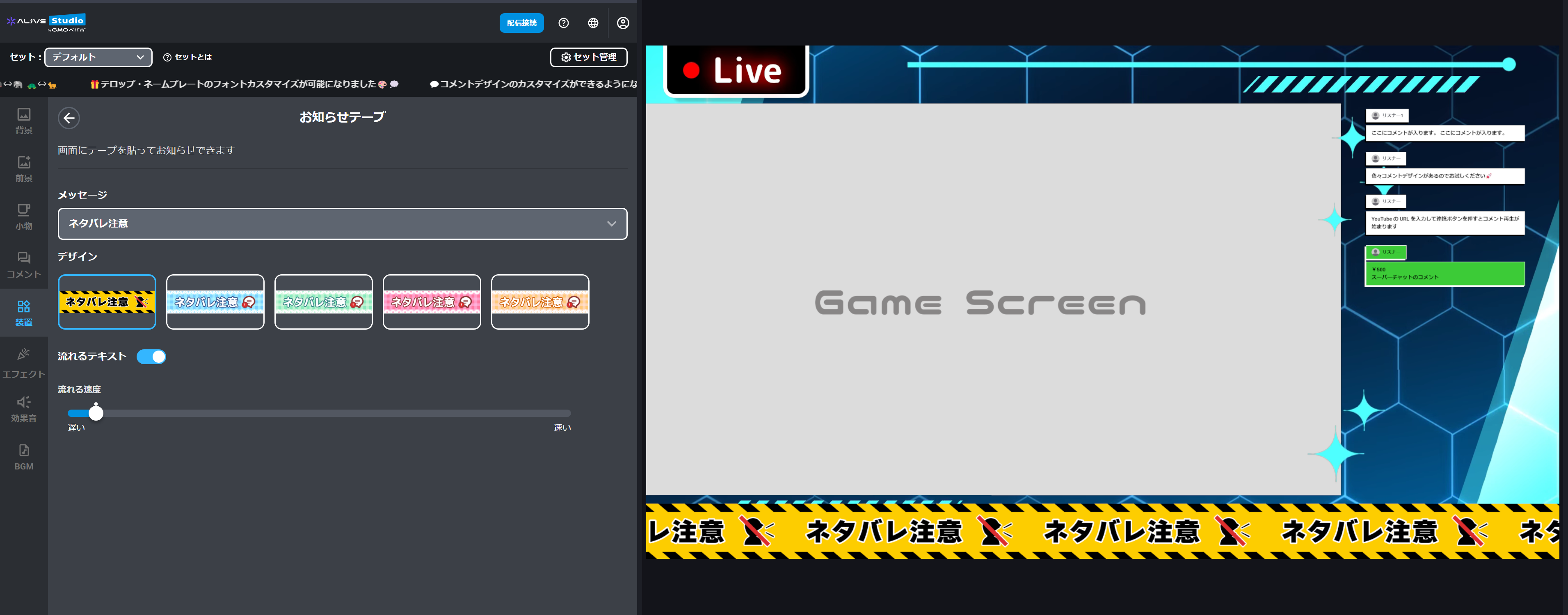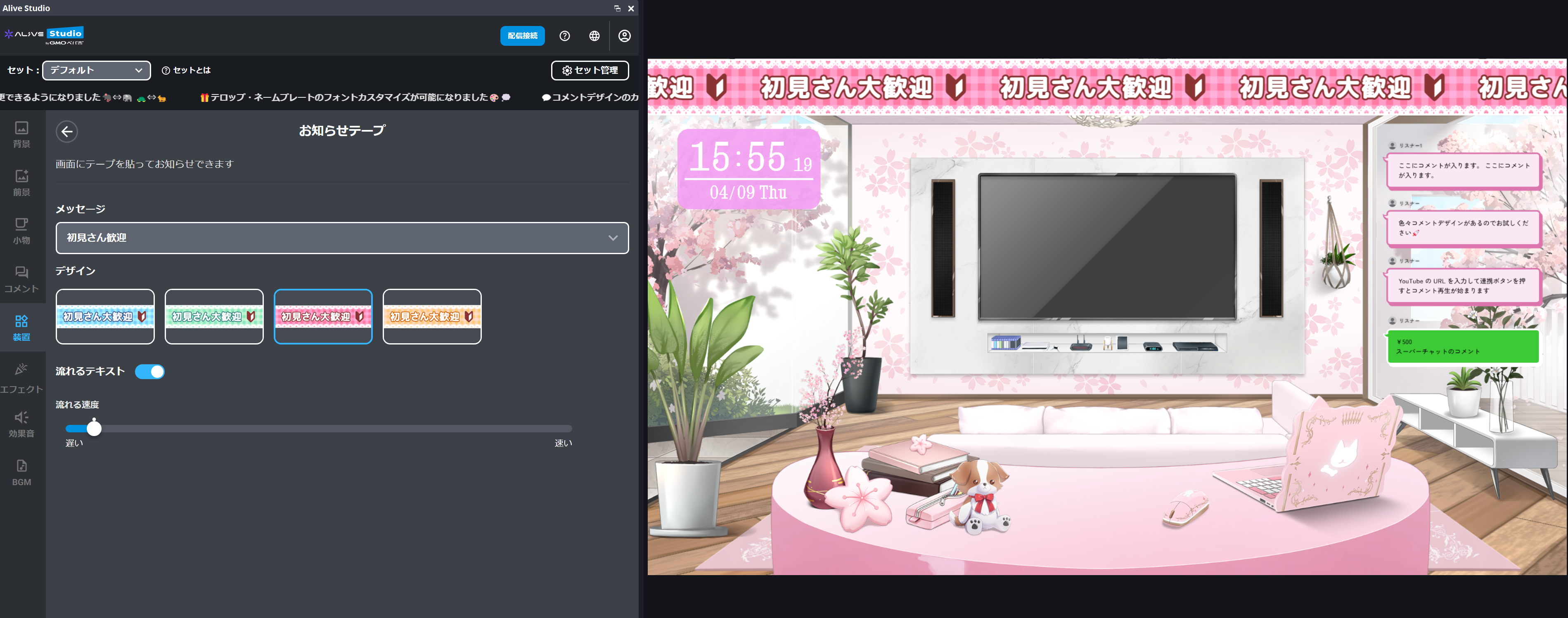 配信画面にお知らせを表示できる「お知らせテープ」装置を追加しました🎉